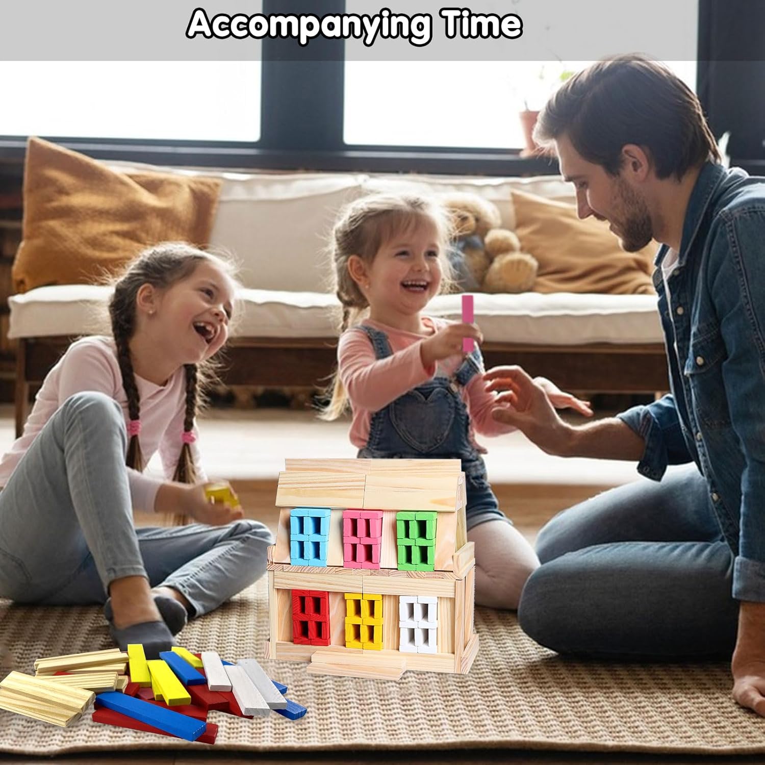 The game consists of colored wooden sticks that enable the child to: