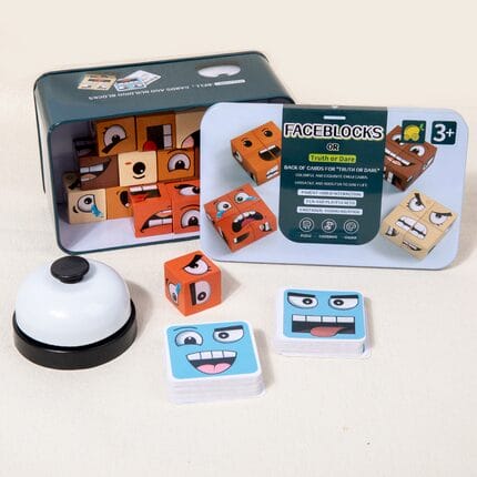 I compete with my friends to form the facial expression on the card by moving the cubes Whoever finishes first presses the bell and wins the card