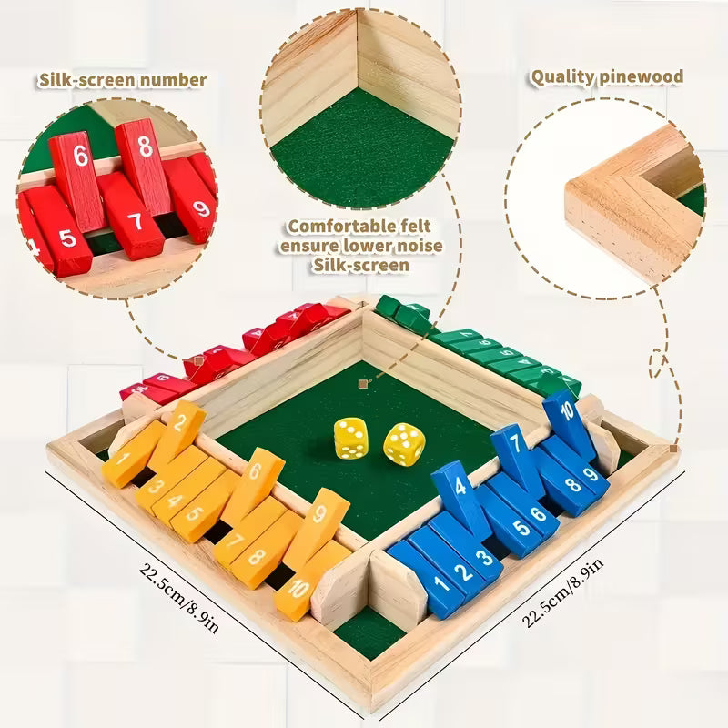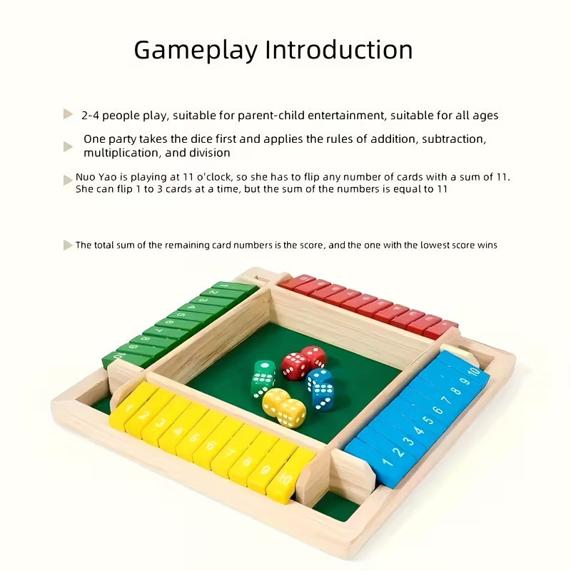 – A square wooden base containing in each side rectangles with numbers that can be lowered or raised