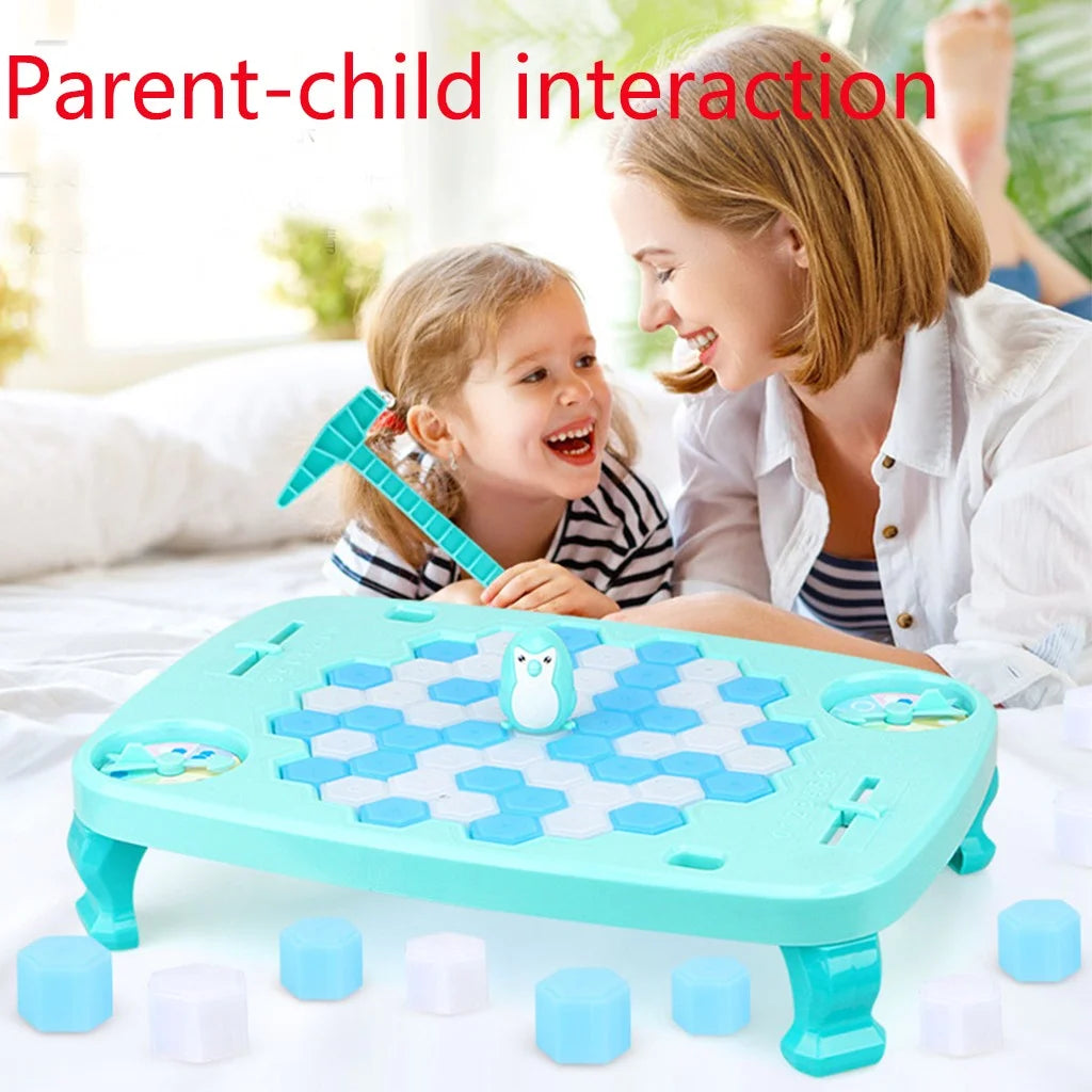 The game is attached to a card with a rotating arrow, so you either hit the pieces with a hammer or you move the penguin