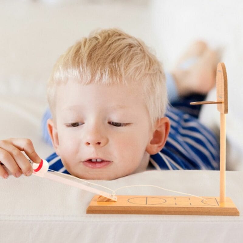 The game consists of a wooden base containing a basket with a ball fixed with a string that the child corrects towards the basket to score goals