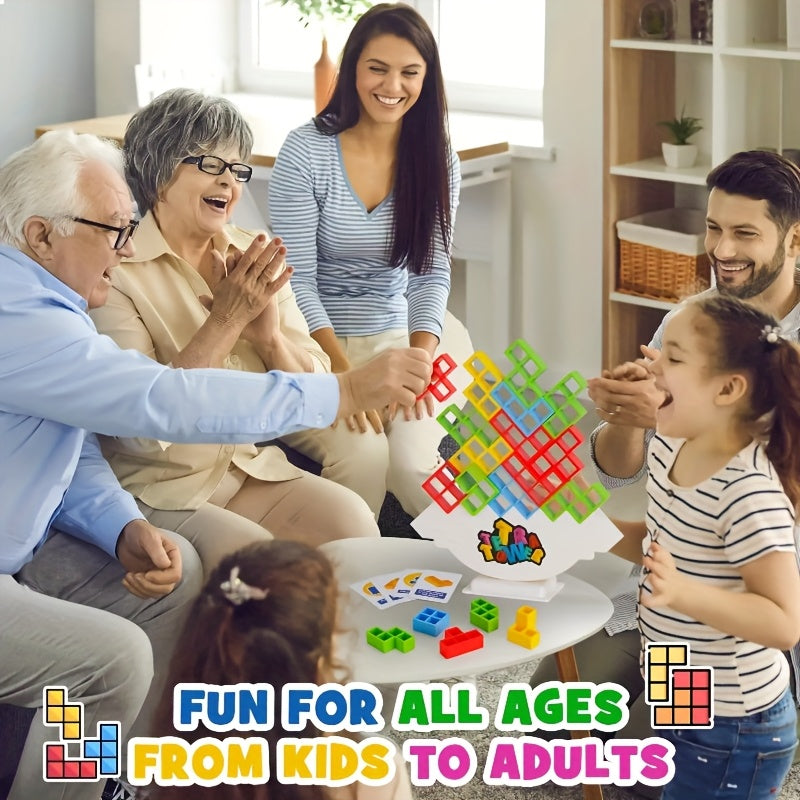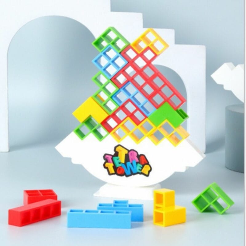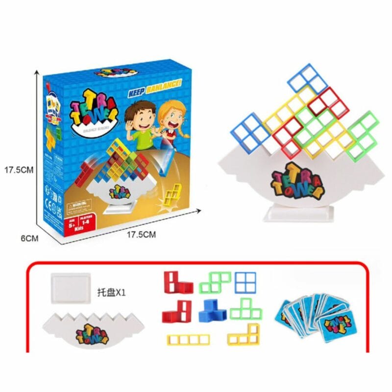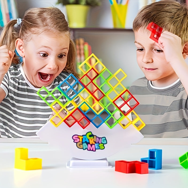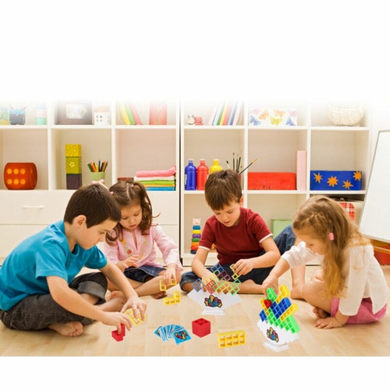 The two players follow the card instructions so that they arrange the suggested pieces on top of the swinging base, remove or replace a piece